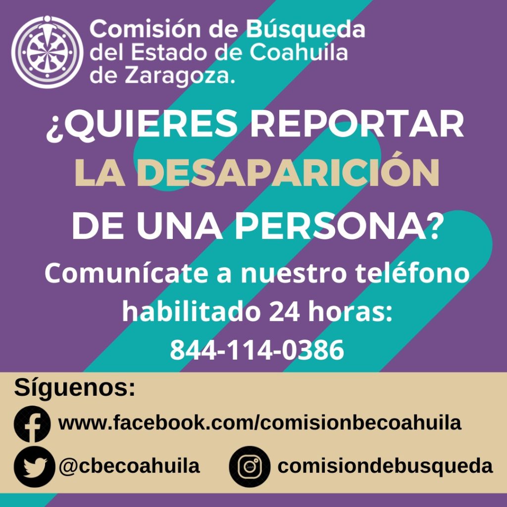 “El teléfono es el 844 114 0386 está habilitado las 24 horas del día para recibir llamadas para presentar reportes de posibles desapariciones, o bien brindar información o datos que ayuden a determinar la suerte o paradero para la localización. También puede ser a través de las redes sociales https://www.facebook.com/COMISIONBECOAHUILA, https://twitter.com/cbecoahuila e instagram: comisiondebusqueda”, dijo.