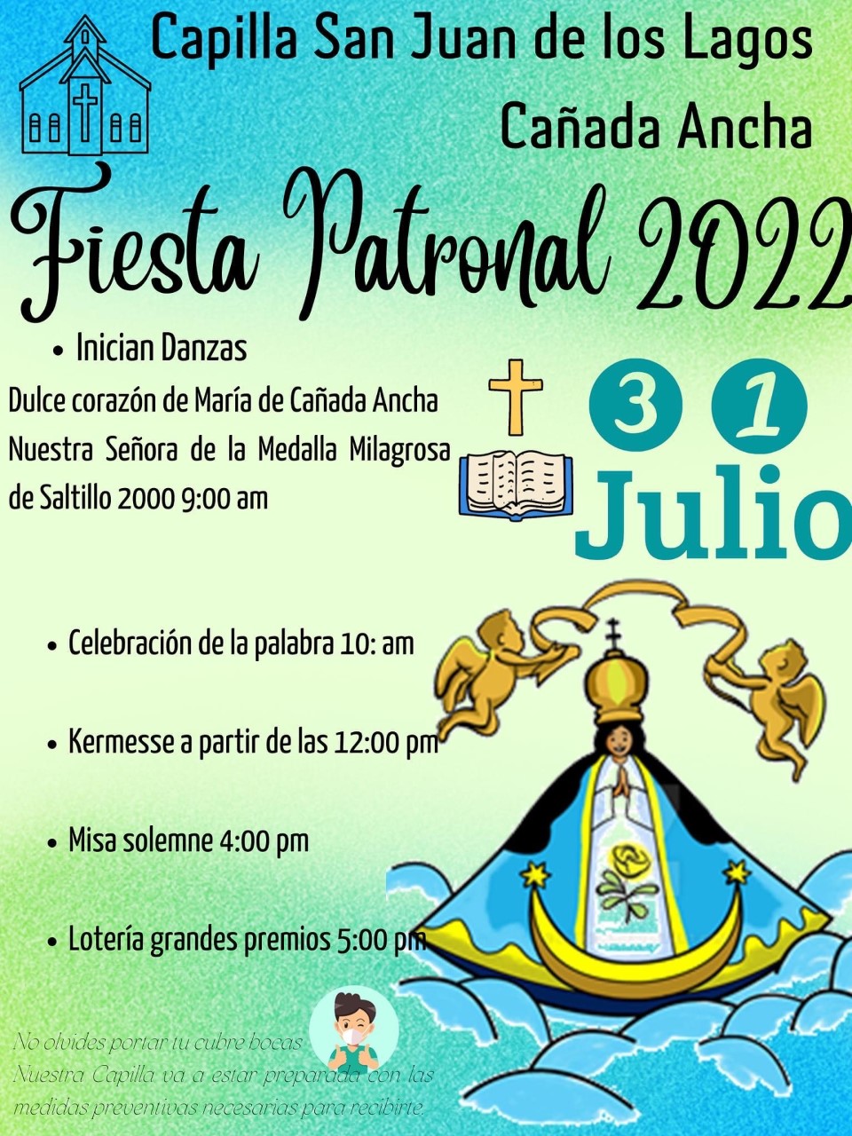 Integrantes de la comunidad de la capilla “San Juan de los Lagos”, en el ejido Cañada Ancha, de Ramos Arizpe, invitan a toda la población en general a su fiesta patronal 2022, la cual se realizará este próximo domingo 31 de julio, en el templo en mención, a partir de las 9:00 horas, llevando a cabo diversas actividades.