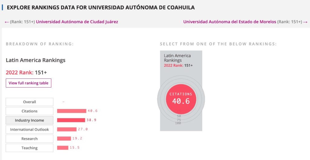 En el ranking THE han sido incluidas 29 universidades mexicanas, posicionando a la Universidad Autónoma de Coahuila en el lugar 7 por la calificación obtenida en el rubro de “Citación”, lo que representa su influencia en menciones de la investigación de la región.