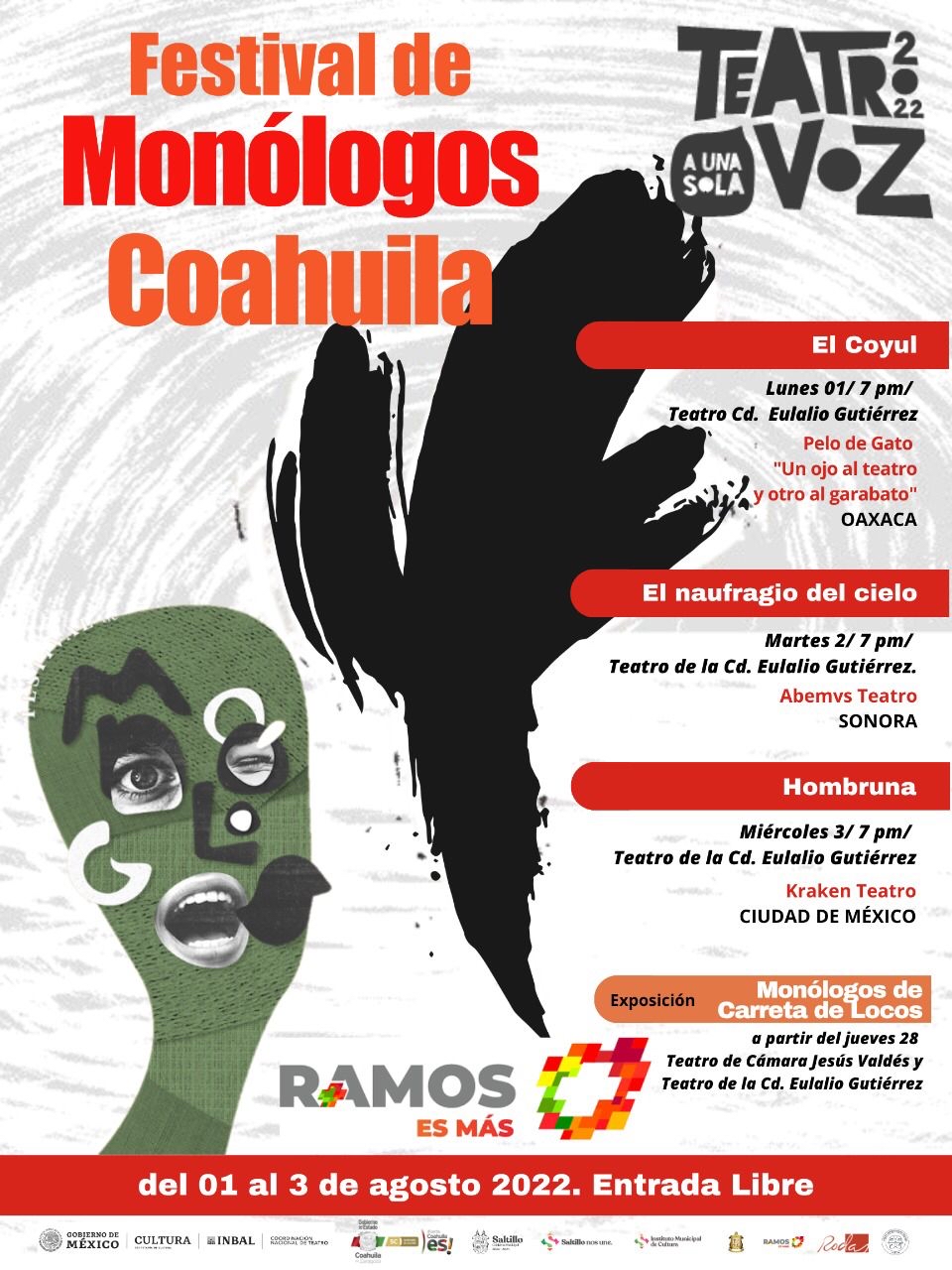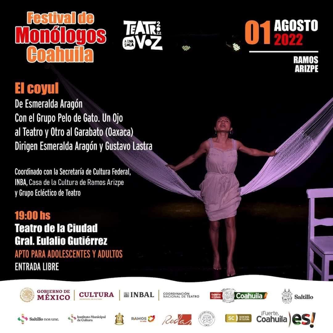 Indicó que este tipo de presentaciones culturales son sin costo alguno, mismas que darán comienzo desde este lunes 1 de agosto en punto de las 19:00 horas, con el monólogo “El Coyul”, de Esmeralda Aragón, con el grupo Pelo de Gato «Un ojo al teatro y otro al garabato» procedente del estado de Oaxaca.