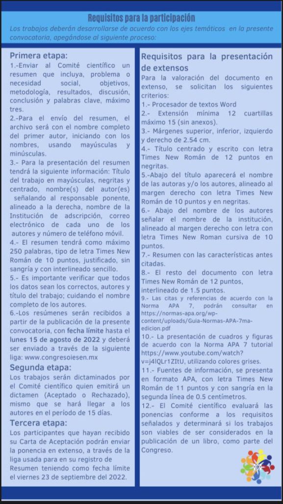 Los interesados podrán participar como asistentes o ponentes, la recepción de trabajos estará abierta hasta el 12 de agosto de 2022 y se deberán de subir en la página www.congresoiesen.mx; las ponencias abordarán alguno de los siguientes ejes temáticos: Educación, Pedagogía, Salud, Psicología, Trabajo Social, Ingenierías, Administración y negocios y Ciencias sociales y humanidades.