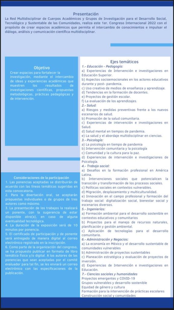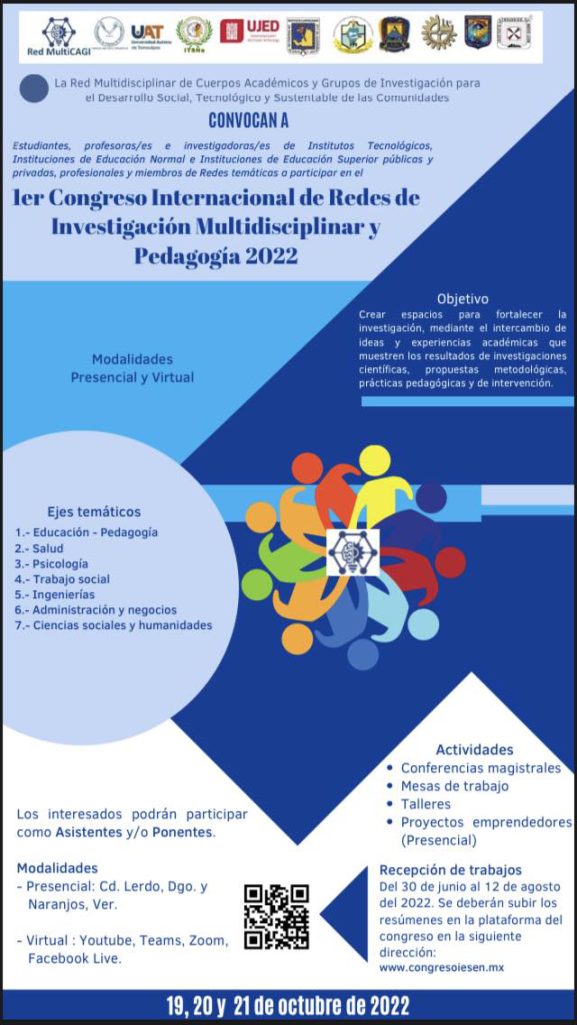 Torreón, Coahuila.- La Escuela de Ciencias de la Comunidad de la Universidad Autónoma de Coahuila, invita al Primer Congreso Internacional de Redes de Investigación Multidisciplinar y Pedagogía 2022, esto al formar parte de la Red Multidisciplinar de Cuerpos Académicos y Grupos de Investigación para el Desarrollo Social, Tecnológico y Sustentable de las Comunidades.