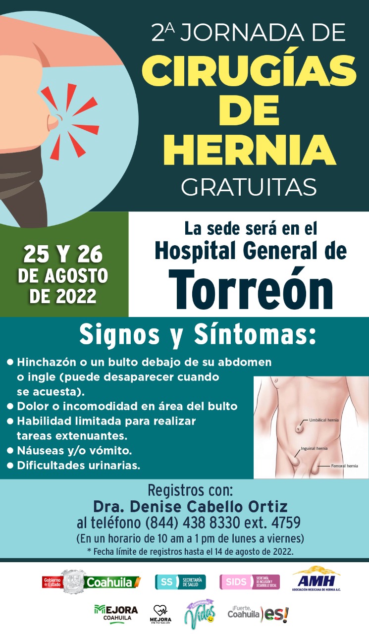 El Gobierno del Estado, a través de su Secretaría de Salud, informó que el próximo 25 y 26 de agosto se llevará a cabo la Segunda Jornada de Hernioplastias en el Hospital General de Torreón.