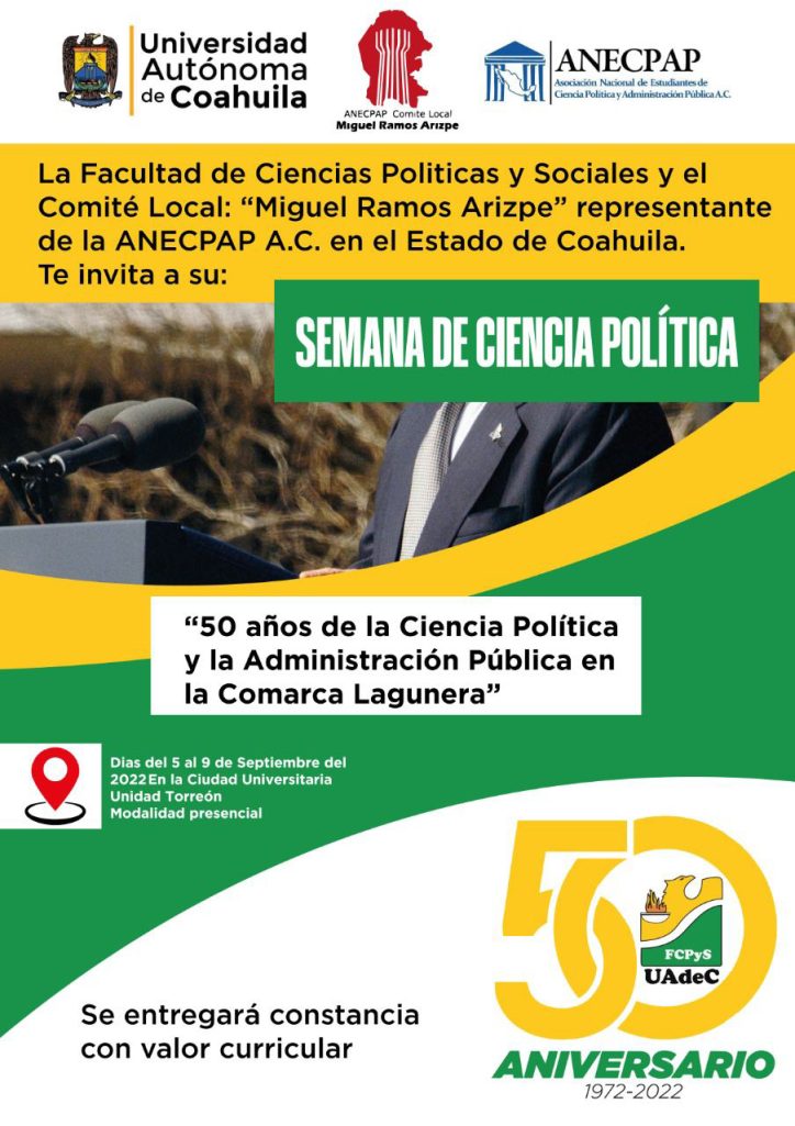 Torreón, Coahuila.- Como parte de los festejos por su 50 aniversario, la Facultad de Ciencias Políticas y Sociales Unidad Torreón de la Universidad Autónoma de Coahuila, invita a la “Semana Política: 50 años de la Ciencia Política y la Administración Pública en la Comarca Lagunera” que se llevará a cabo del 5 al 9 de septiembre de 2022.