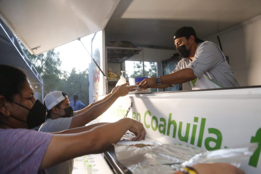Sabinas, Coahuila.- Este jueves entró en operación la cocina móvil operada por DIF Coahuila para brindar alimentos calientes a familiares de los mineros y personal de rescate que opera en Aguijta, Municipio de Sabinas.