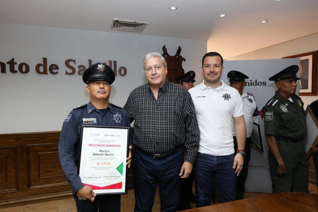 El alcalde José María Fraustro Siller entregó reconocimientos y estímulos económicos a un grupo de 16 elementos cuya trayectoria dentro de la Policía Municipal de Saltillo va de los 28 a los 39 años de servicio.
