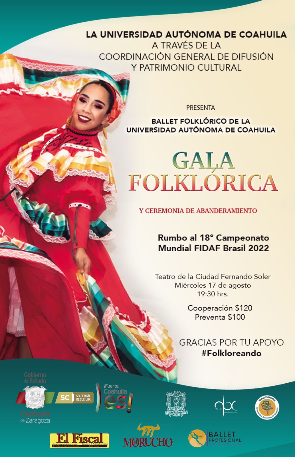La Universidad Autónoma de Coahuila (UA de C) a través de la Coordinación General de Difusión y Patrimonio Cultural realiza una atenta invitación a todo el público en general para participar en la “Gala Folklórica” y ceremonia de abanderamiento que llevará a cabo el Ballet Folklórico de la Universidad, el próximo miércoles 17 de agosto en el Teatro de la Ciudad Fernando Soler en punto de las 19:30 horas.