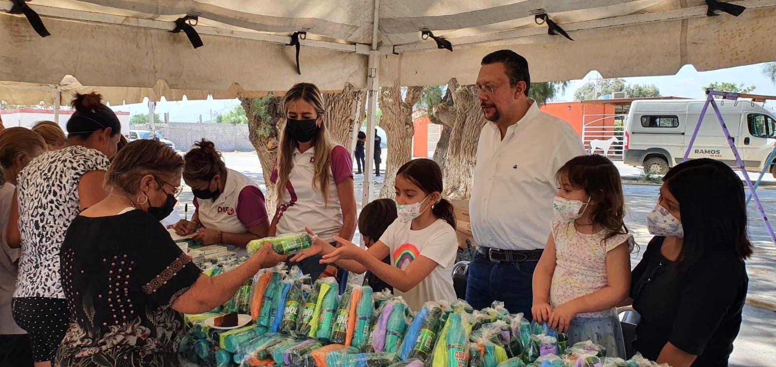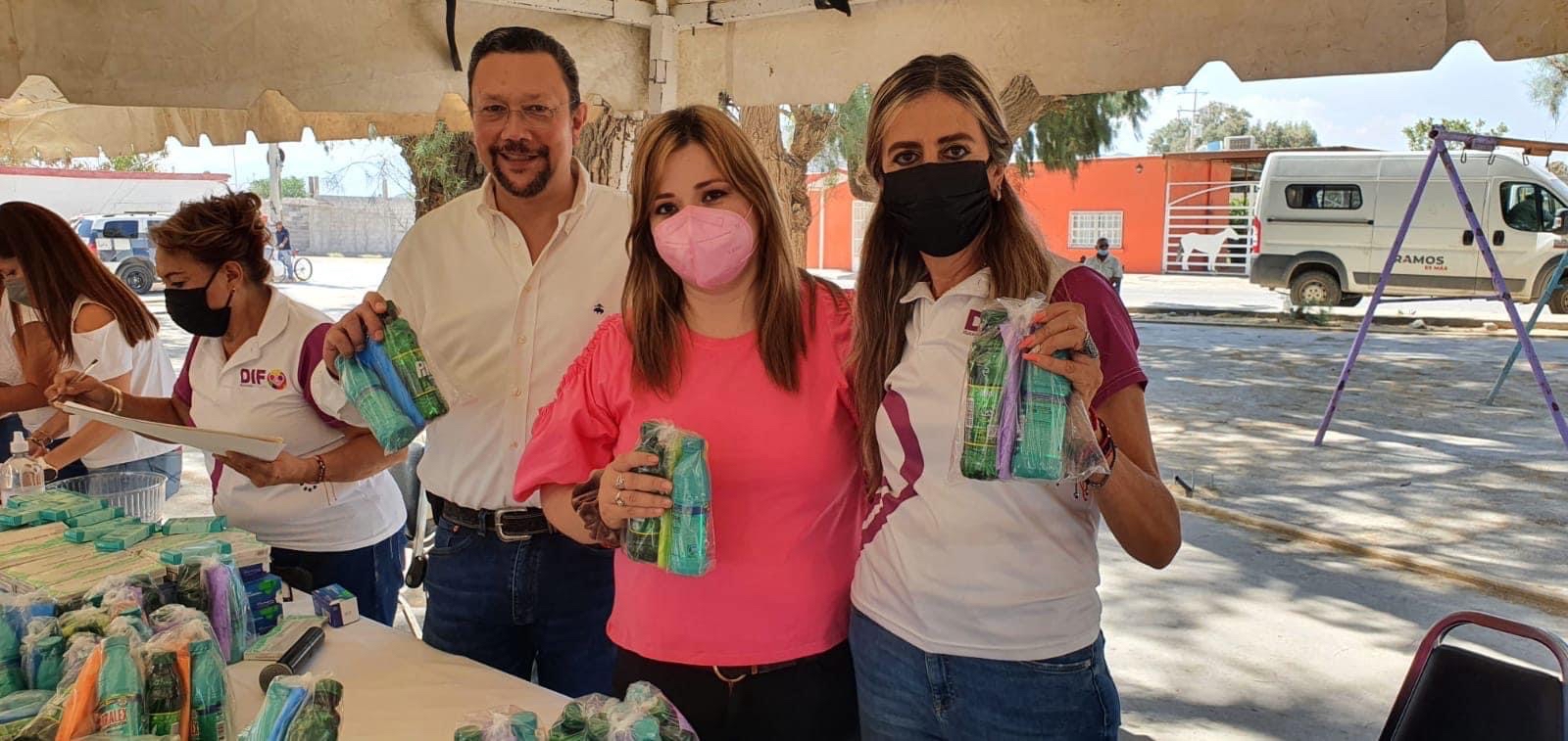 Más de 60 familias resultaron favorecidas con la entrega de kits para la higiene personal, así como de limpieza para el hogar, durante la brigada de salud que organizó el DIF Ramos Arizpe en el ejido Paredón.