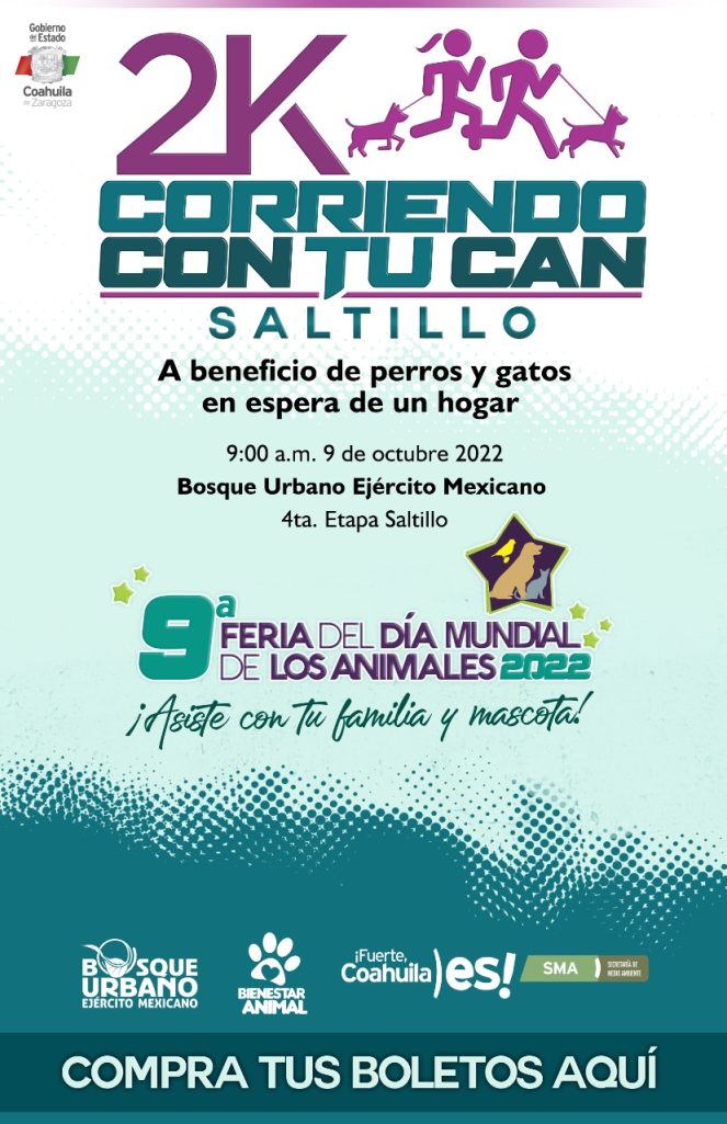 El próximo 9 de octubre de este 2022, la Secretaría de Medio Ambiente de Coahuila realizará en Saltillo la carrera 2K “Corriendo con tu Can”, por lo que mantiene abierta la invitación a asociaciones civiles de la localidad, enfocadas en rescatar y dar asilo a perros y gatos rescatados de las calles, para que participen en la venta de sus boletos de participación, ya que lo que logren recaudar por este concepto será destinado íntegramente a apoyarlos para que continúen con ambas labores.