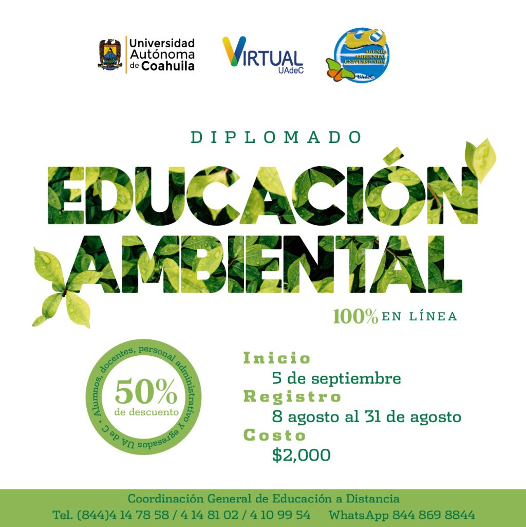 La Universidad Autónoma de Coahuila, a través de la Coordinación General de Educación a Distancia y la Agenda Ambiental Universitaria, convoca a cursar el Diplomado en Educación Ambiental en Línea, que iniciará el 5 de septiembre de 2022.
