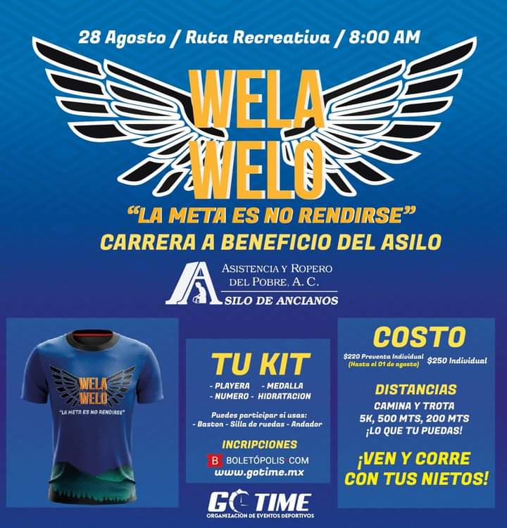 La directora del asilo de ancianos Ropero del Pobre AC, Paulina Udave, hizo la invitación a los saltillenses a participar en la carrera 5K Wela Welo, misma que tendrá lugar el próximo 28 de agosto en el marco del Día del Adulto Mayor, a partir de las 8:00 de la mañana, en la Ruta Recreativa.