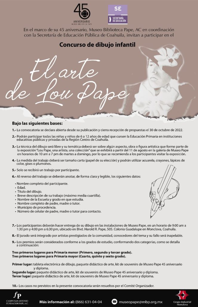 Monclova, Coahuila.- El Museo Biblioteca Pape AC, en el marco de su 45 Aniversario y en coordinación con la Secretaría de Educación de Coahuila, invitan a niñas y niños de 6 a 12 años de edad a participar en el concurso de dibujo “El Arte de Lou Pape”.