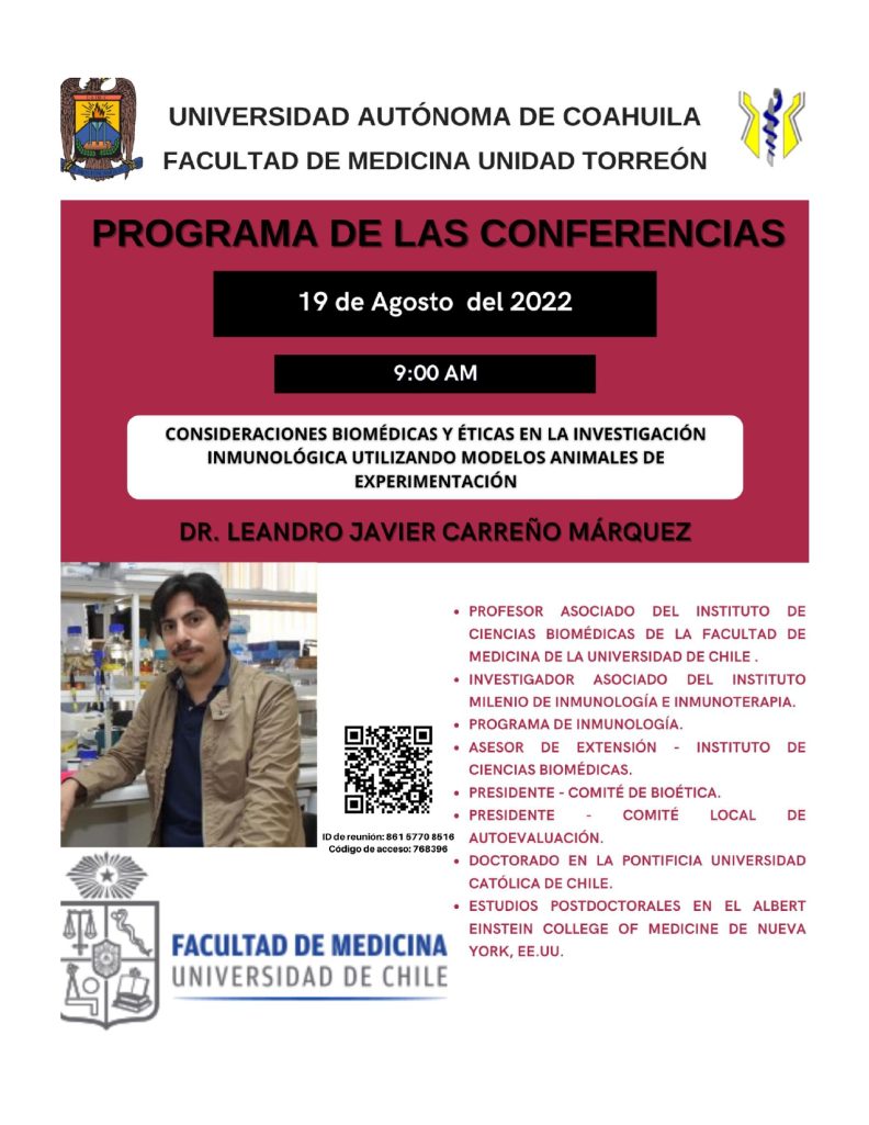 Por otro lado, el 19 de agosto a las 9:00 se desarrollará “Consideraciones biomédicas y éticas en la investigación inmunológica utilizando modelos animales de experimentación” a cargo del Dr. Leandro Javier Carreño Márquez de la Universidad de Chile; a las 10:00 “Aportaciones de los primates no humanos a las neurociencias” por el Dr. Braulio Hernández Godínez y la Dra. Alejandra Ibáñez Contreras de Diagnostico Neurofisiológico Veterinario S.A.S de C.V.