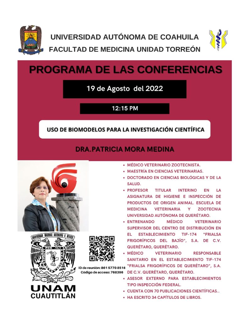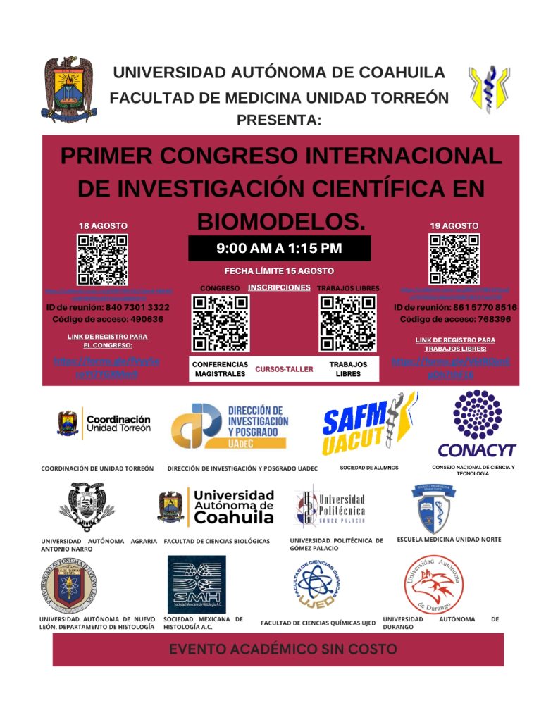 Torreón, Coahuila.- La Facultad de Medicina Unidad Torreón de la Universidad Autónoma de Coahuila invita al Primer Congreso Internacional de Investigación Científica en Biomodelos, el cual se llevará a cabo el 18 y 19 de agosto de 2022 de 9:00 a 13:15 horas de manera virtual a través de la plataforma Zoom y de manera presencial en el auditorio del plantel.