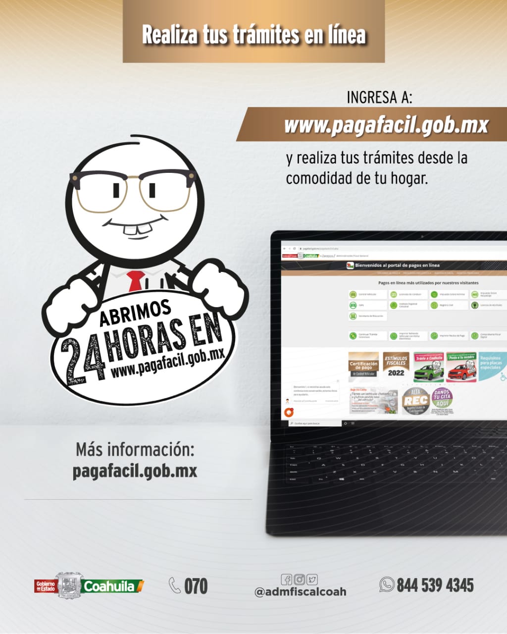 El Administrador Fiscal agregó: “Además, en el Facebook @Admfiscalcoah, está el Asistente Inteligente de Messenger, con el que están disponibles los trámites de control vehicular, cambio de propietario, alta de vehículo nuevo y licencias de conducir, y en el caso de requerir asistencia fiscal, un operador responderá todas tus dudas”.