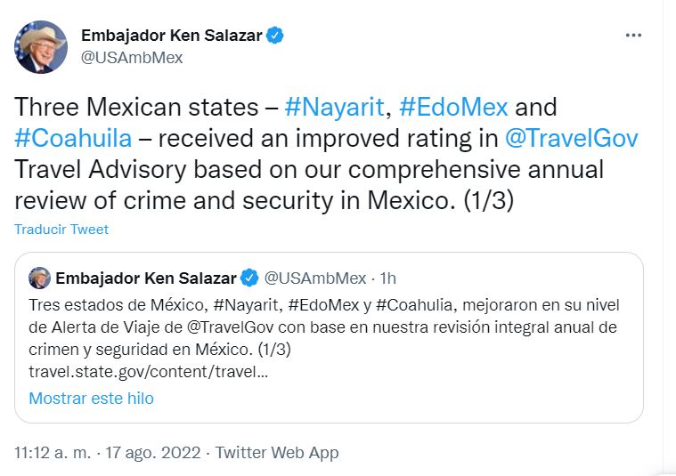«Felicito a Nayarit, al Estado de México, y a Coahuila y por mejorar en sus niveles de seguridad y, por lo tanto, un mejor nivel dentro de la Alerta de Viaje de 2022», expresó el funcionario estadounidense a través de la circular difundida por la citada Embajada.