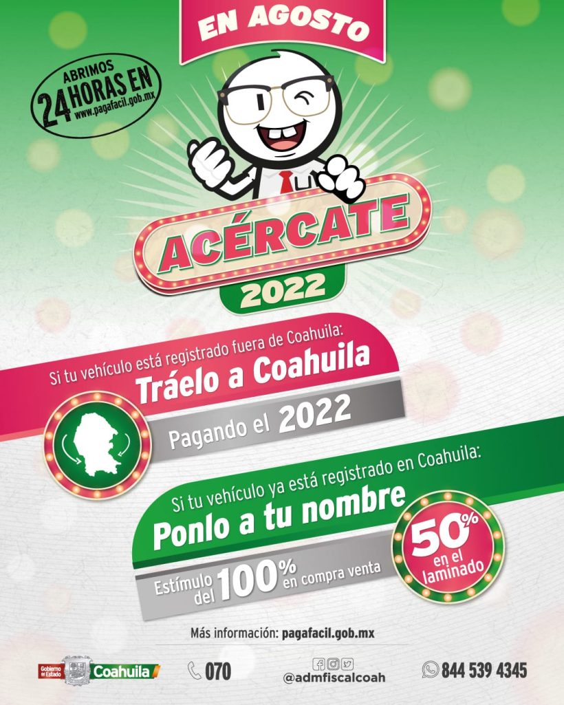 “Y para los contribuyentes que tienen su vehículo registrado fuera de la entidad, está el programa ¡Tráelo a Coahuila!, pagando sólo el Ejercicio Fiscal 2022, se condona al 100 por ciento de ejercicios anteriores”, explicó el Administrador Fiscal.