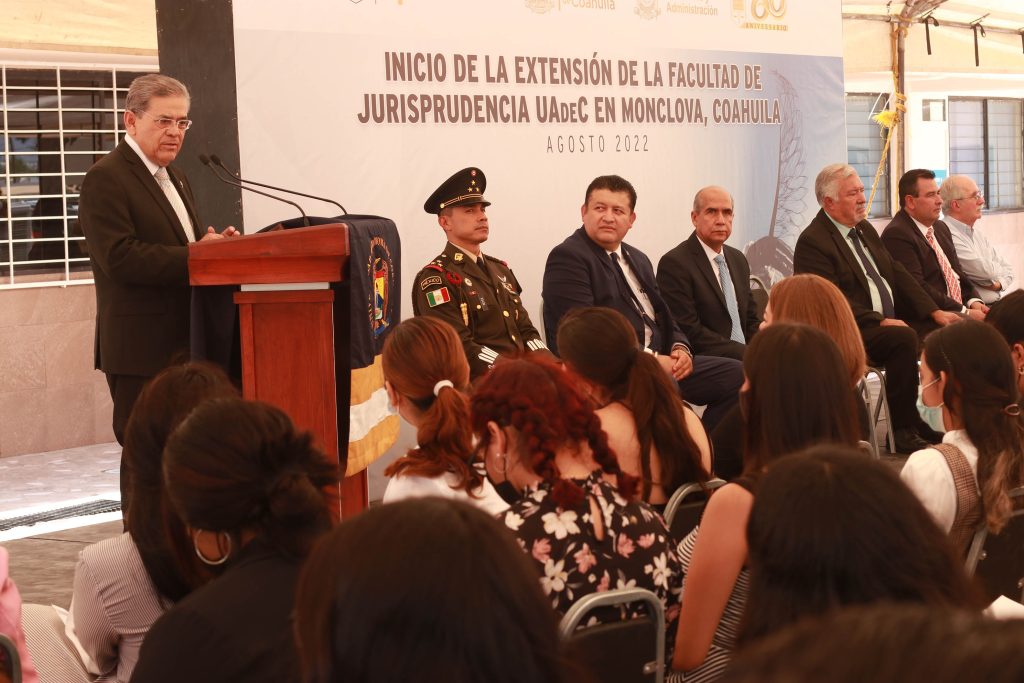 Monclova, Coahuila.- Este lunes la Universidad Autónoma de Coahuila llevó a cabo el inicio de la extensión de la Facultad de Jurisprudencia en Monclova, la cual tiene como sede la Facultad de Contaduría y Administración, esto con el objetivo de ofrecer el programa de la Licenciatura en Derecho, cuya primera generación está conformada por 53 estudiantes.