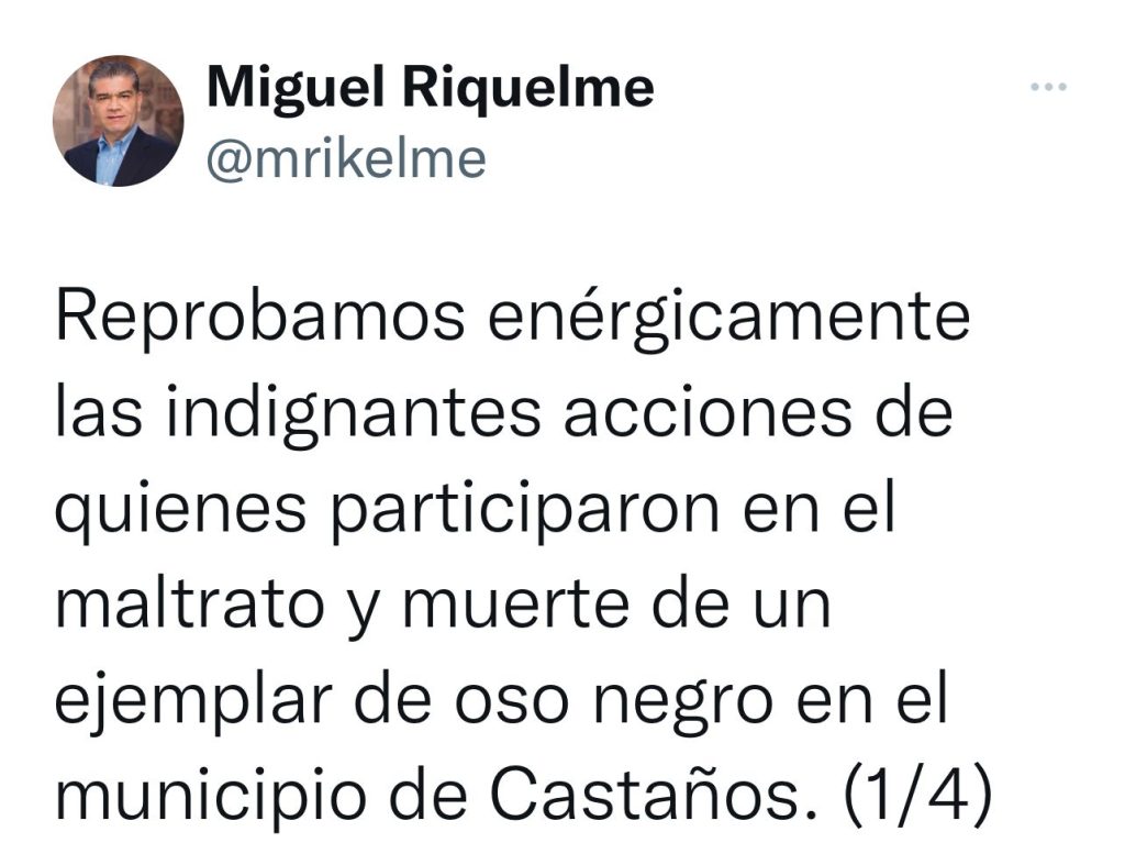A través de sus redes sociales, el gobernador de Coahuila, Miguel Ángel Riquelme Solís, reprobó las acciones de quienes participaron en la muerte de un oso negro en Castaños, y anunció que ya se abrió una investigación sobre este caso por parte de la PROFEPA, PROPAEC y la Fiscalía de Coahuila de acuerdo a sus facultades.
