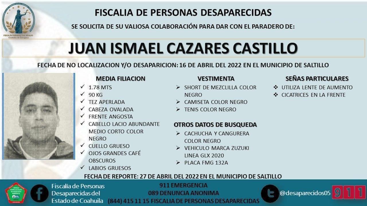 Juan Ismael Cazares Castillo, de 31 años, quien tenía reporte de desaparecido en Saltillo desde el pasado mes de abril, fue localizado sin vida en el anfiteatro del Estado de Nuevo León.