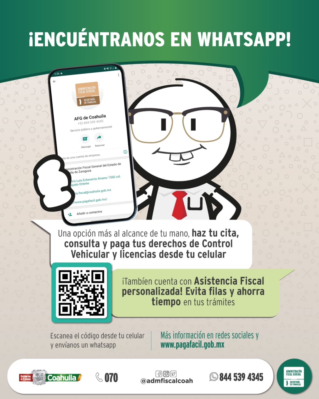Desde la comodidad de tu celular, realiza tus trámites y consultas de control vehicular desde el WhatsApp de la Administración Fiscal General de Coahuila (AFG).
