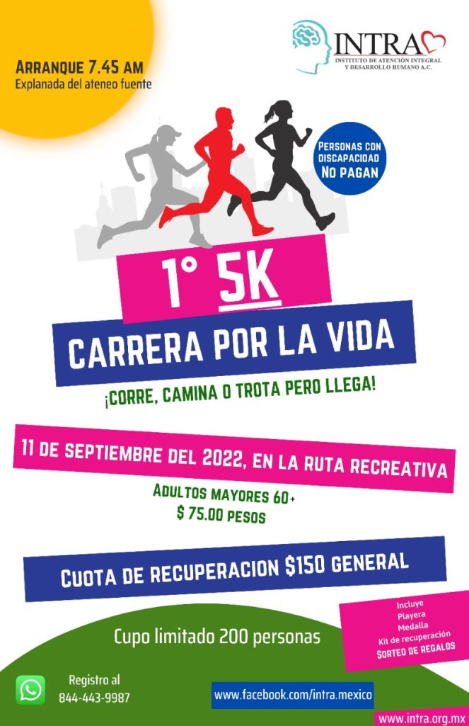 El próximo 11 de septiembre de este 2022, en la Ruta Recreativa de Saltillo, la Asociación Civil “Instituto de Atención Integral y Desarrollo Humano” (Intra) realizará su primera 5K “Carrera por la Vida”, cuyas inscripciones servirán para recaudar fondos económicos que utilizará para generar campañas contra el suicidio en la ciudad capital.