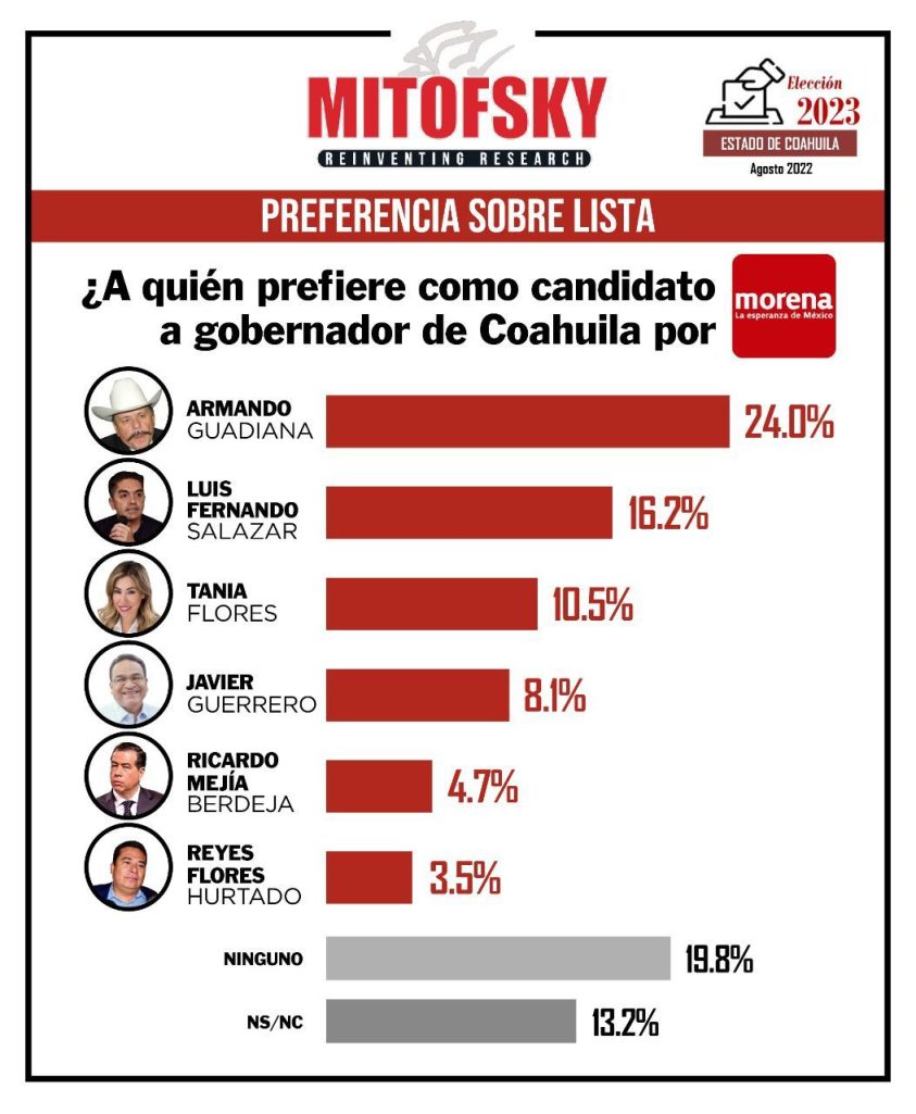 Según los resultados del sondeo del mes de agosto realizado por la encuestadora nacional Mitofsky, reconocida por su certeza en los últimos procesos electorales, Armando Guadiana Tijerina se mantiene en el primer lugar de las preferencias para abanderar a Morena como candidato a la gubernatura de Coahuila en el 2023.