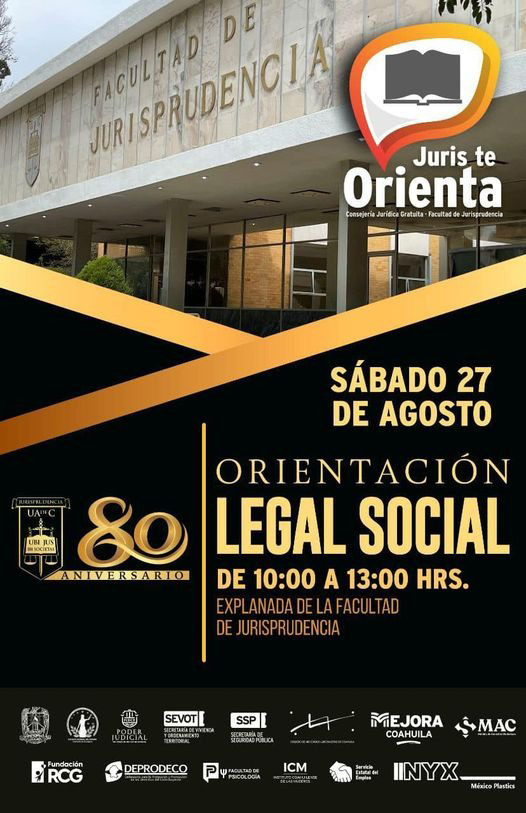 La Facultad de Jurisprudencia de la Universidad Autónoma de Coahuila, convoca a la comunidad universitaria y público en general a asistir a la jornada gratuita “Juris te Orienta”, que se llevará a cabo este sábado 27 de agosto de 2022 de 10:00 a 13:00 horas.