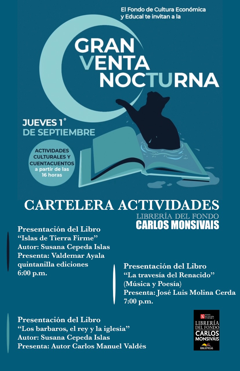 La Gran Venta Nocturna, que concluirá a la 1:00 de la mañana del 2 de septiembre, contará también con presentaciones de los libros «Islas de Tierra Firme», de la autora Susana Cepeda Islas; «La Travesía del Renacido», de José Luis Molina Cerda y «Los Bárbaros, el Rey y la Iglesia», también de la autoría de Cepeda Islas, a las 6:00 y 7:00 de la tarde y 8:00 de la noche, respectivamente.