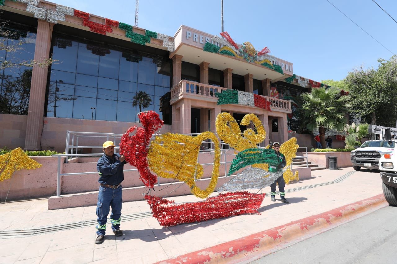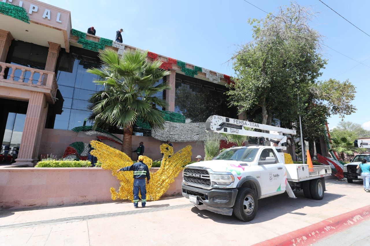 En Saltillo, personal de la Dirección de Servicios Públicos inició la colocación de adornos patrios previo a la llegada del mes de septiembre en el que se celebra la Independencia de México.