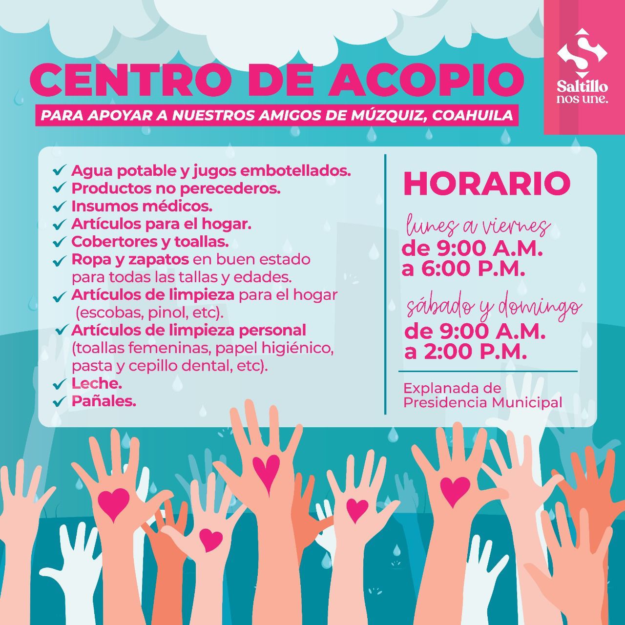 El Gobierno Municipal, en coordinación con DIF Saltillo, abre a partir de este sábado su centro de acopio a fin de recibir donativos en apoyo de los afectados por las inundaciones en Múzquiz, Coahuila.