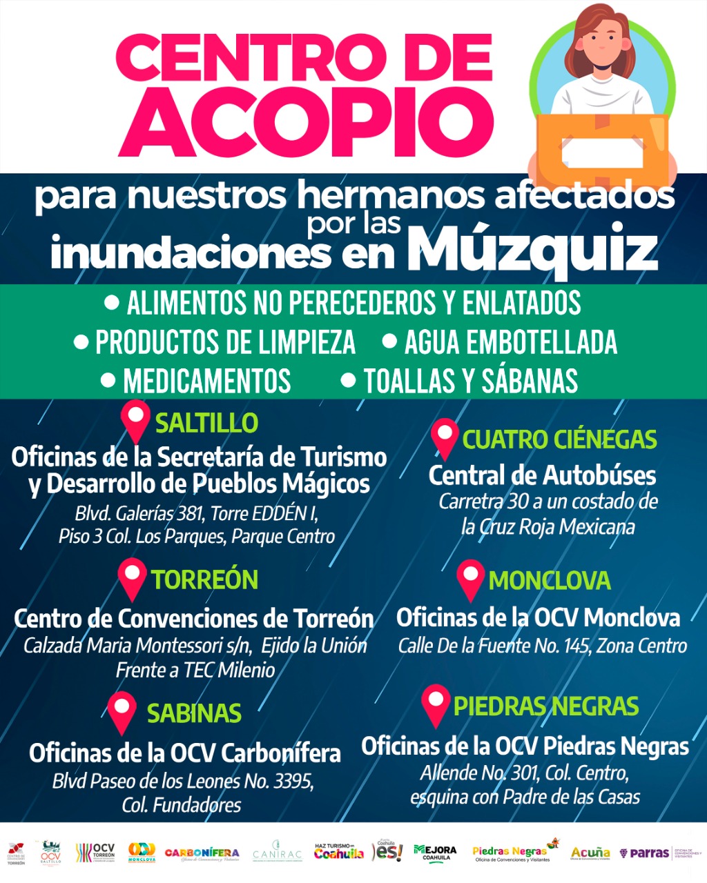 En apoyo y solidaridad con la gente del Pueblo Mágico de Múzquiz, la Secretaría de Turismo y Desarrollo de Pueblos Mágicos de Coahuila abrió centros de acopio en las diferentes regiones del estado, acción que ha sido respaldada por la cadena de valor del turismo.