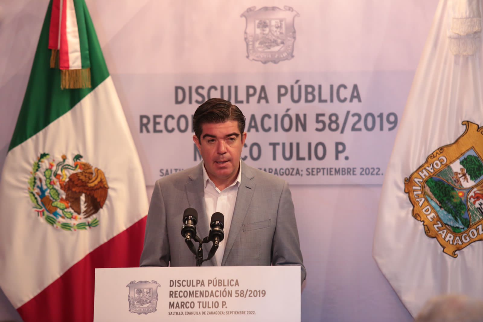 El gobernador Miguel Riquelme reiteró que esta disculpa pública, por tanto, conlleva el reconocimiento de las violaciones a las prerrogativas fundamentales cometidas en contra de Marco Tulio y de las personas migrantes.