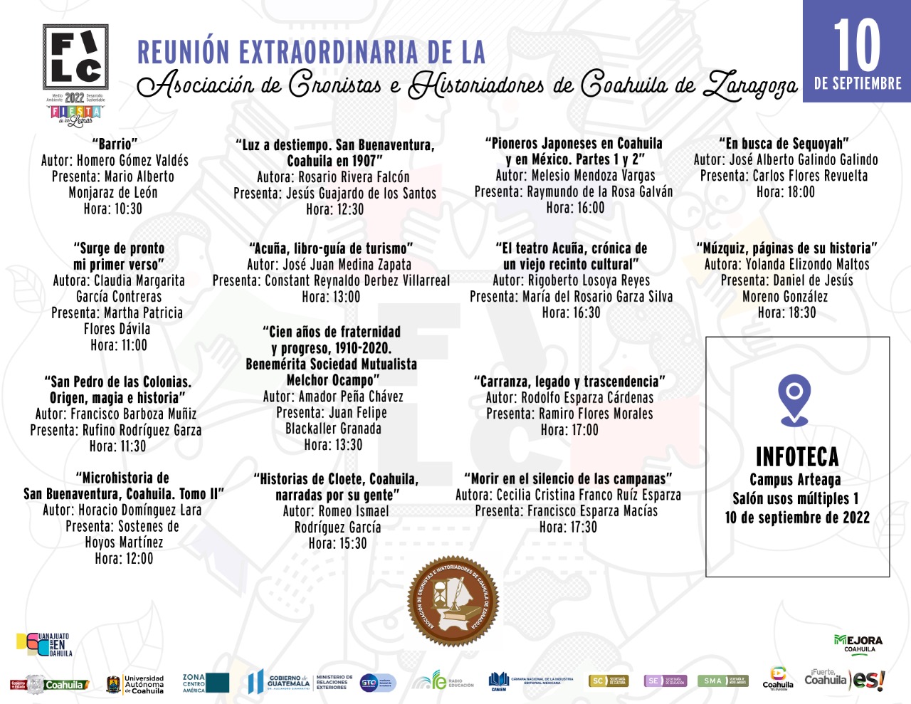 En el marco de la Feria Internacional del Libro Coahuila 2022, el próximo 10 de septiembre, a partir de las 10:00 horas y hasta las 18:00 horas, se realizará una reunión extraordinaria de la Asociación de Cronistas e Historiadores del Estado.