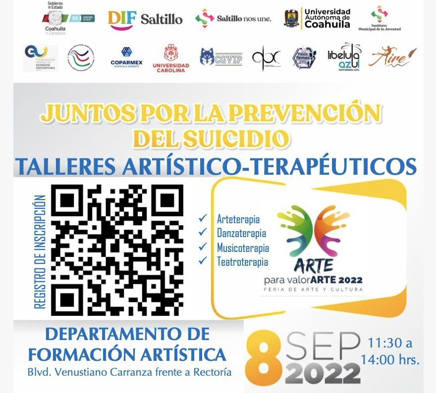 La Universidad Autónoma de Coahuila invita a la comunidad universitaria y público en general a participar en la Feria de Arte y Cultura: “Arte para ValorArte 2022” Juntos por la Prevención del Suicidio, que se llevará a cabo este próximo jueves 8 de septiembre en el Paraninfo del Ateneo Fuente con distintas actividades para público de todas las edades.