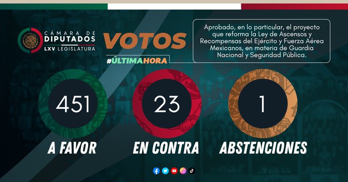 En cuanto a la Ley de Ascensos y Recompensas del Ejército y Fuerza Aérea mexicano registró 458 votos a favor, 26 en contra y una abstención.