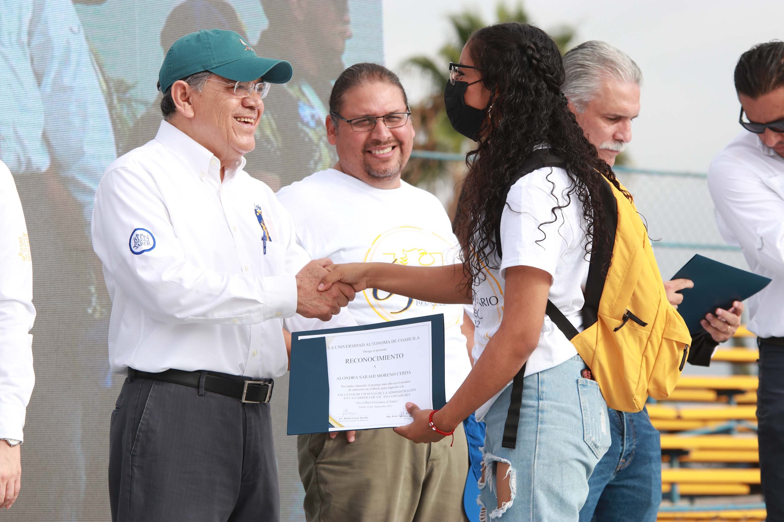 Previo al desfile las autoridades universitarias entregaron reconocimiento a los alumnos que obtuvieron el mejor puntaje: de la Facultad de Arquitectura, Estefanía Fabiola Ávila Charles; Coordinación General de Educación a Distancia, Lic. en Contaduría María Fernanda Guzmán García, Lic. en Administración de Empresas, Virna Natalia Luna Ferriño, Lic. en Administración de Recursos Humanos, Ariadna Mejía Hernández, Lic. en Negocios Internacionales André Oziel Moreno Adame; Facultad de Ciencias de la Comunicación, Lic. en Comunicación Organizacional y Relaciones Públicas, Marla Julieta Pérez Romero, Lic. en Producción en Medios, Citlaly Wendolin Santamaria Avilés.