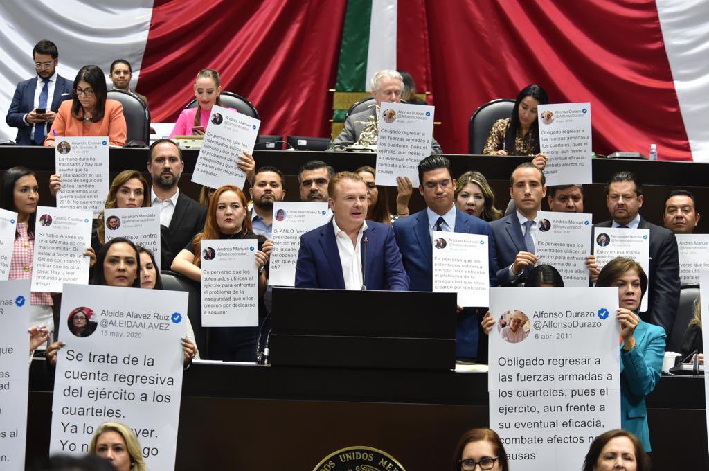Los primeros en sacar los carteles fueron los diputados del PAN. Desde tribuna, mostraron capturas de tuits del presidente Andrés Manuel López Obrador y otros funcionarios que, antes de este sexenio, cuestionaban la militarización del país.