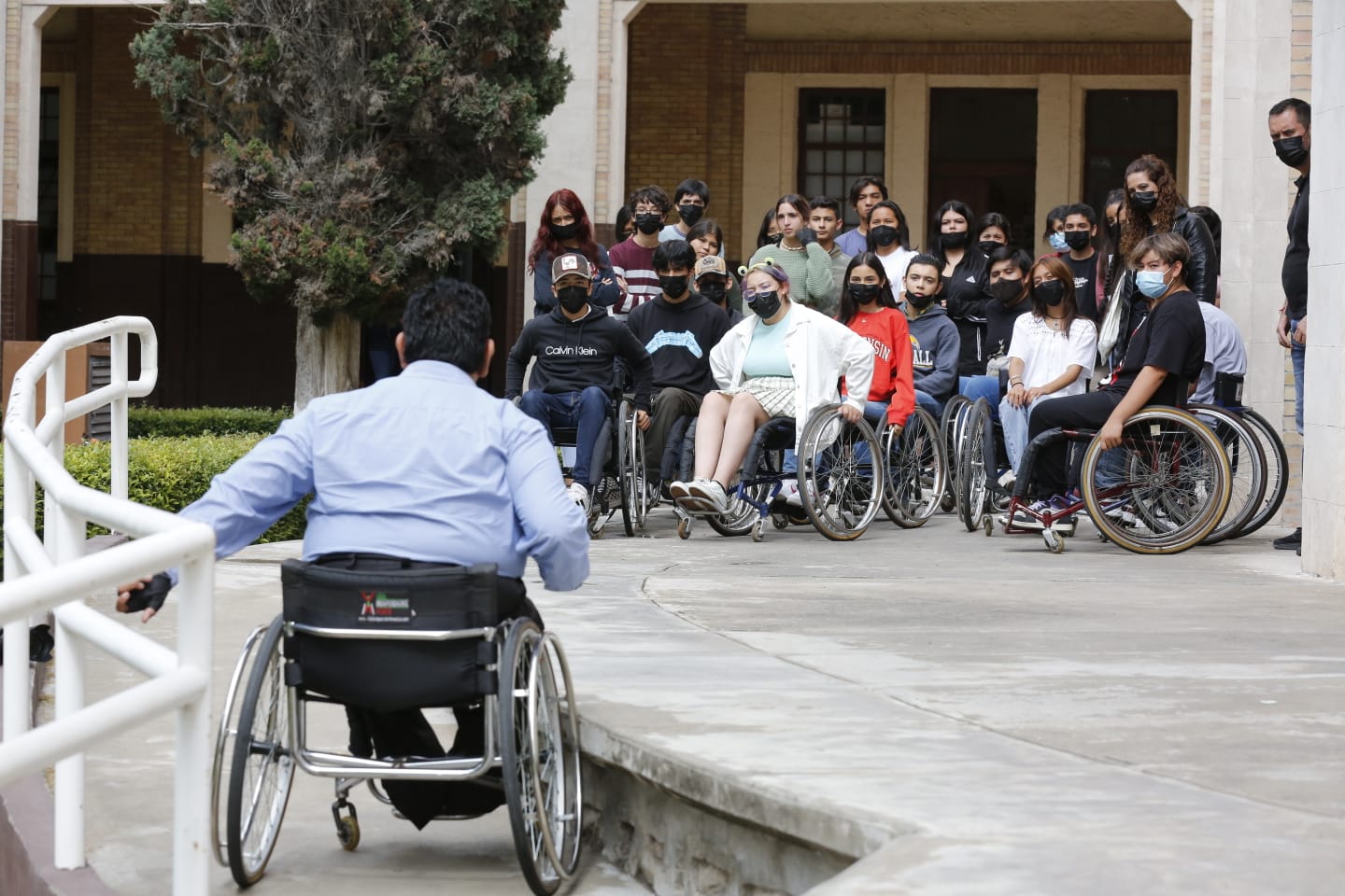 Las actividades contemplaron una plática por parte de Miguel Ángel Ruelas, Jefe del Programa Estatal de Inclusión para la Personas con Discapacidad, así como recorridos en sillas de ruedas y caminatas con uso de bastón y vendaje en los ojos para las y los alumnos, a fin de que experimenten las barreras que a diario enfrentan las personas que viven con discapacidad visual o motriz.