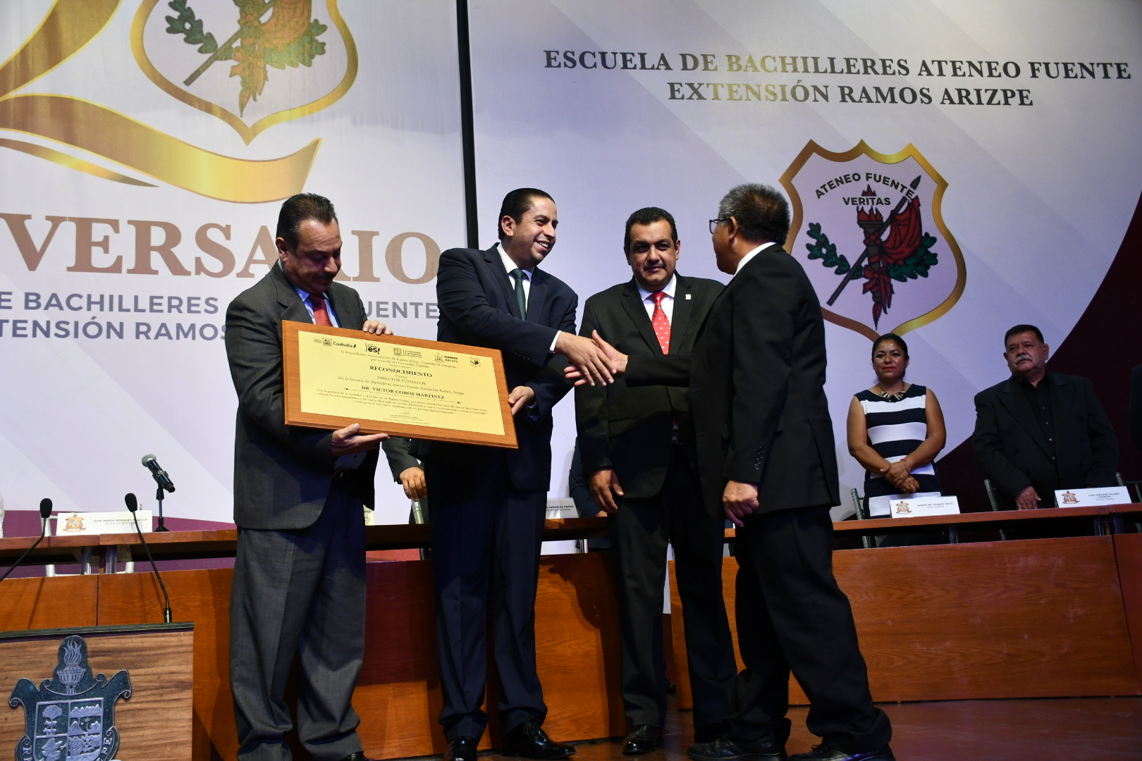 Las autoridades dieron paso a la entrega de reconocimientos a ex directores, ex maestros y ex alumnos de la primera generación egresada de la institución educativa, destacando el trabajo de Víctor Cobos Martínez, director fundador del Ateneo Fuente extensión Ramos Arizpe, Omar Torres Vázquez, profesor fundador, la plantilla de maestros fundadores; igualmente a Ángeles González Silva y Rocio Guadalupe Farías Suárez, representantes de los ex alumnos de la primera generación.