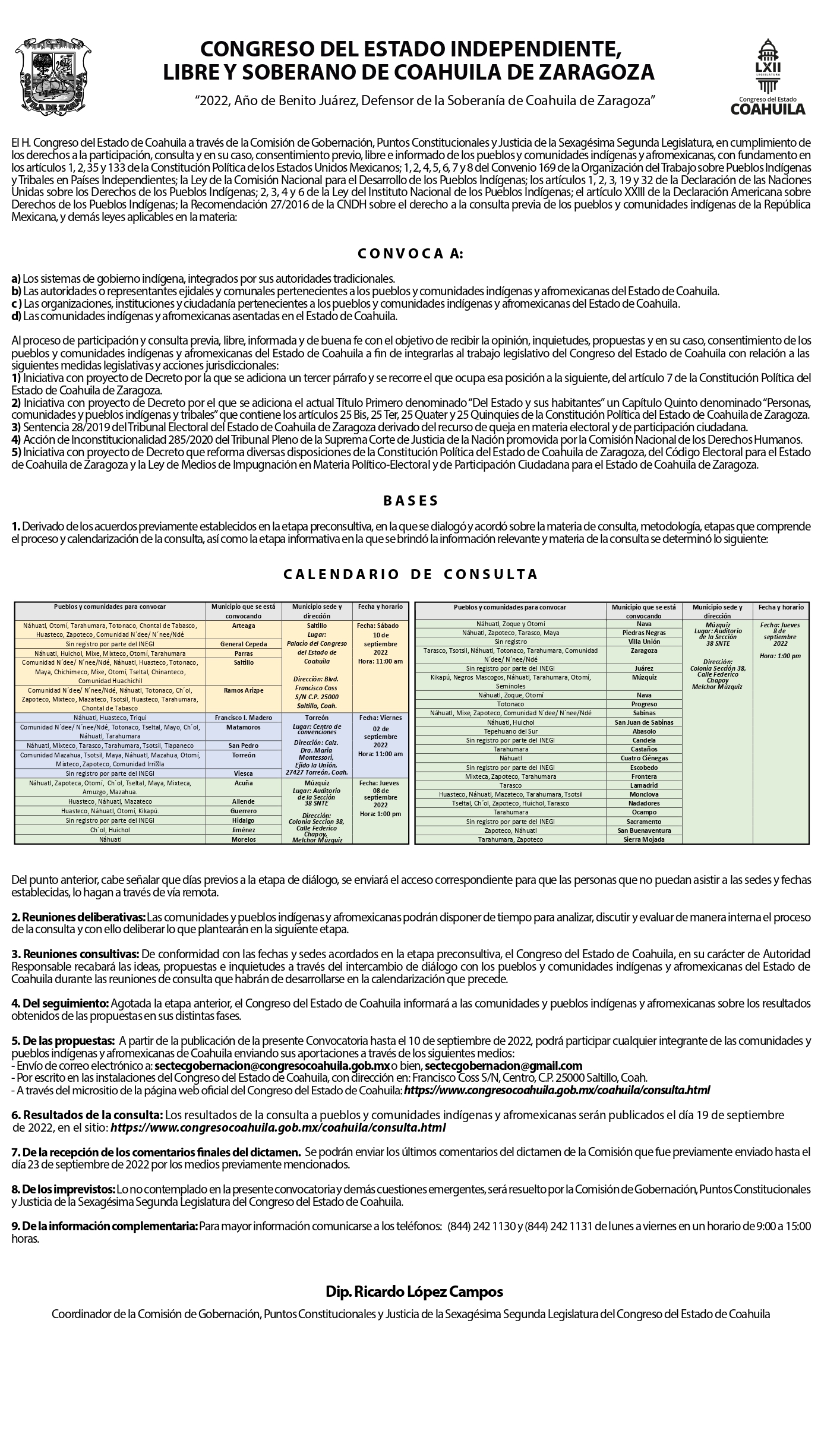 El Congreso del Estado de Coahuila a través de la Comisión de Gobernación, Puntos Constitucionales y Justicia de la Sexagésima Segunda Legislatura convoca a las comunidades y pueblos indígenas y afromexicanas asentadas en la Región Sureste de Coahuila, al proceso de participación y Consulta previa, libre, informada y de buena fe con el objetivo de recibir su opinión, inquietudes, propuestas y en su caso consentimiento, a fin de integrarlas al trabajo legislativo con relación a diversas medidas legislativas y acciones jurisdiccionales en materia de representación político-electoral, que se llevará a cabo en el municipio de Saltillo.