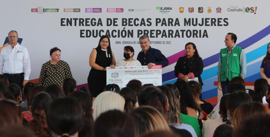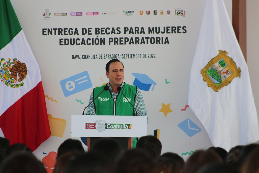 Nava, Coahuila de Zaragoza.- Cerca de 400 becas del Programa para Mujeres Preparatoria Gratuita, así como una techumbre en el CBTIS 239, entregó el gobernador Miguel Ángel Riquelme Solís en el Municipio de Nava, como parte de una gira de trabajo por la Región de los Cinco Manantiales, donde también puso en marcha obras de agua potable y recarpeteo por más de 21 millones de pesos.