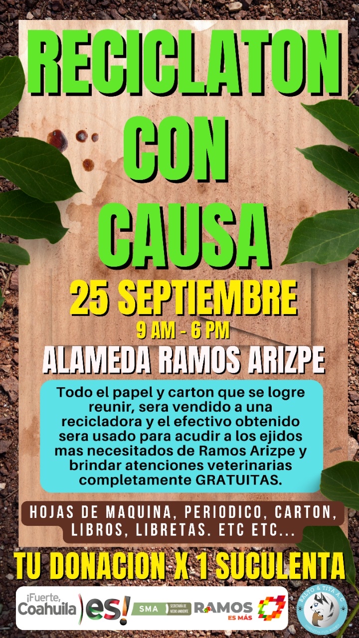 La agrupación protectora de animales ‘Balto y Tita A.C.’ en coordinación con la Secretaría del Medio Ambiente en Coahuila (SEMA) y el Gobierno Municipal de Ramos Arizpe, invitan a las familias de esta ciudad a participar en el “Reciclatón con Causa” con el objetivo de reunir la mayor cantidad posible de material reciclable, con cuya venta se busca obtener recursos económicos que serán destinados a distintos albergues de la Región Sureste donde se ofrece refugio a perros y gatos que están en espera de ser adoptados.