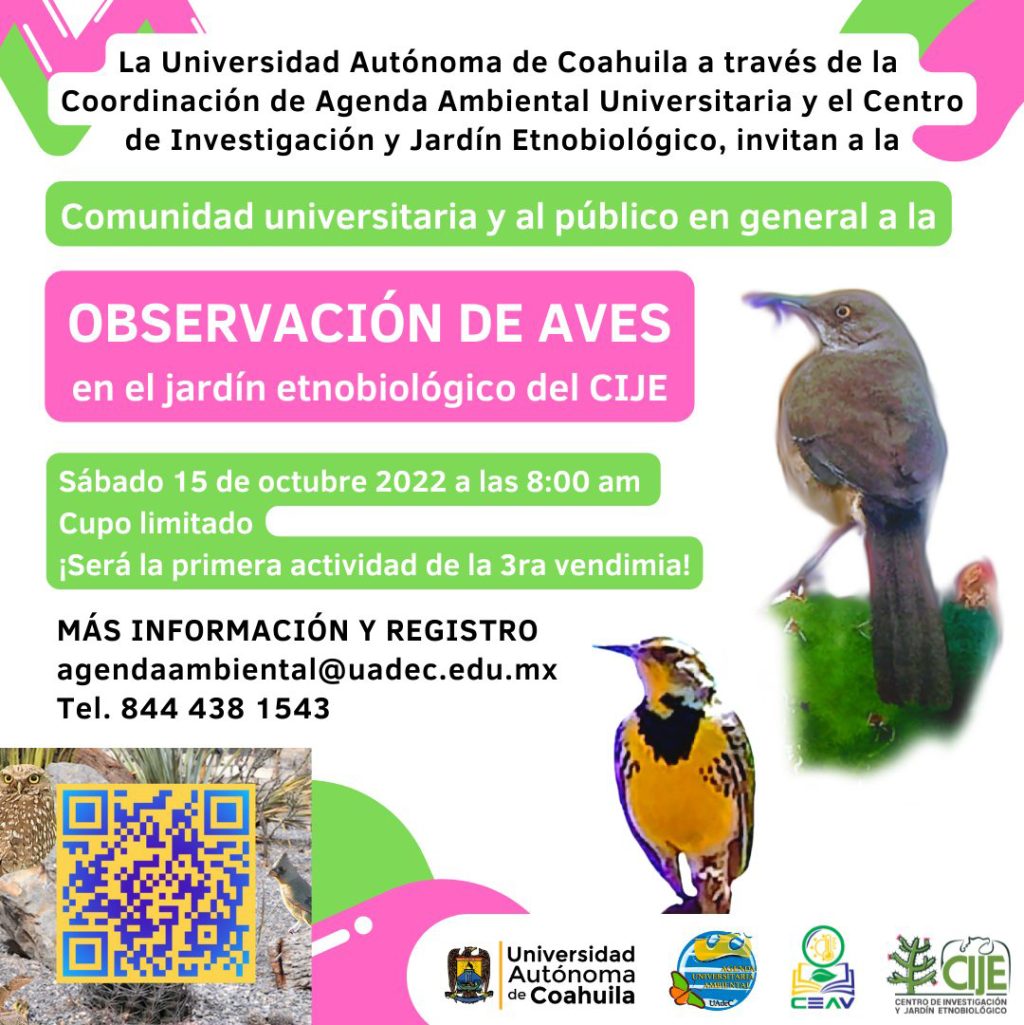 La actividad forma parte de la “Tercera Vendimia Artesanal y Gastronómica Viesca Pueblo Mágico 2022” que se llevará a cabo el 15 de octubre de 2022, por lo que la observación de aves se realizará a las 8:00 de la mañana y los interesados deberán de registrarse en el código QR publicado en la página de Facebook Cije UA de C.