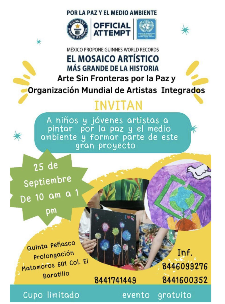 El Grupo Anjor de Mexico, la asociación cultural Arte sin Fronteras por la Paz y la Organización Mundial de Artistas Integrados, invitan a la niñez y juventud de Ramos Arizpe a participar en el proyecto mas ambicioso e importante de los últimos años, se trata de «El Mosaico Artístico más grande de la historia», con una meta inicial de miles de obras realizadas por artistas, jóvenes, niñas y niños.