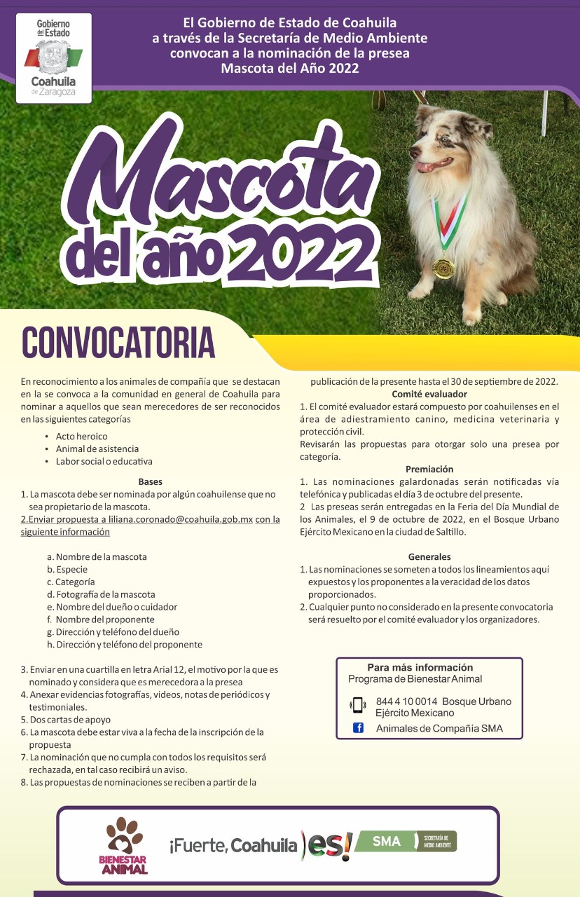La mascota debe ser nominada por algún coahuilense que no sea el propietario; las bases están publicadas en la página de Facebook SMA Coahuila y concluye el 30 de septiembre.