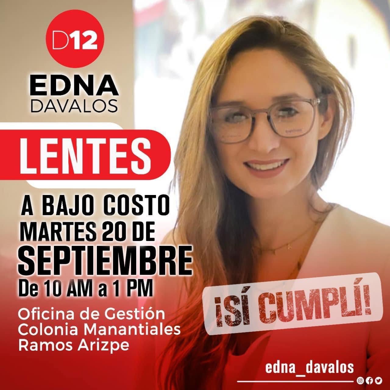 La diputada local por el PRI y representante del distrito 12 en el Congreso del Estado, Edna Dávalos Elizondo, invita a la población que habita en Ramos Arizpe y el resto de la Región Sureste, este martes 20 de septiembre a aprovechar una nueva campaña de examen de la vista gratuito en la que además se ofrecerán anteojos con aumento a bajo costo para toda la familia.