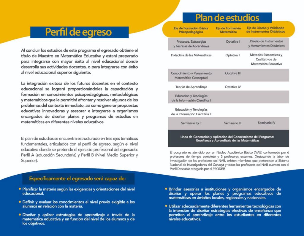 El plan de estudios se encuentra estructurado en tres ejes temáticos fundamentales, articulados con el perfil de egreso, según el nivel educativo donde se pretende el ejercicio profesional del egresado: Perfil A (educación Secundaria) y Perfil B (Nivel Medio Superior y Superior); para más información, comunicarse al teléfono (844) 414 47 39, con el coordinador del posgrado Dr. José David Zaldívar Rojas y través del correo electrónico david.zaldivar@uadec.edu.mx.  (EL HERALDO)