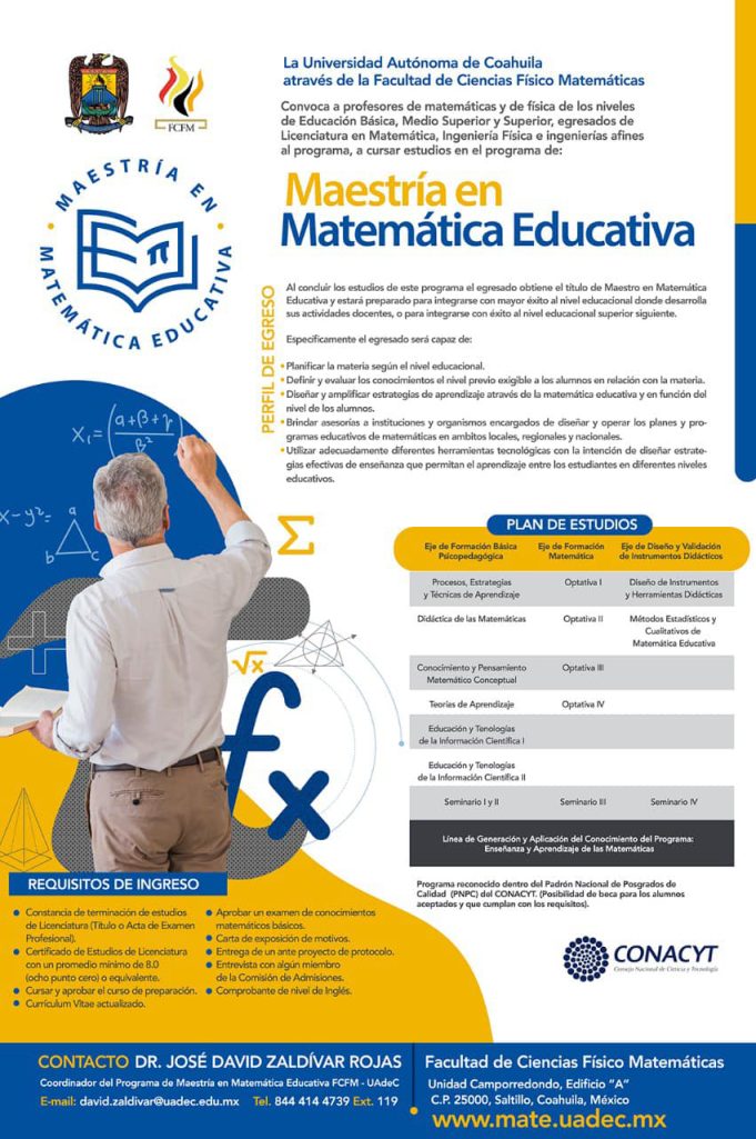 La Universidad Autónoma de Coahuila, a través de la Facultad de Ciencias Físico Matemáticas, ofrece la Maestría en Matemática Educativa, reconocida dentro del Programa Nacional de Posgrados de Calidad de CONACYT y que está dirigida a profesores de matemáticas y de física de los niveles de Educación Básica, Medio Superior y Superior, egresados de Licenciaturas en Matemáticas, Ingeniería Física, Educación, Escuelas Normales, e ingenierías afines al programa.