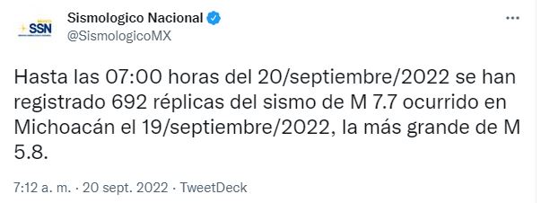 “Hasta las 07:00 horas del 20/septiembre/2022 se han registrado 692 réplicas del sismo de M 7.7 ocurrido en Michoacán el 19/septiembre/2022, la más grande de M 5.8”, precisó la dependencia.